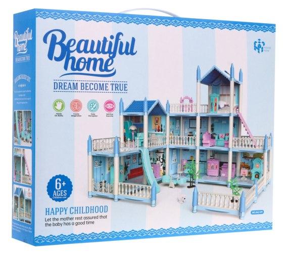 3-piętrowy domek dla lalek Prezent dla dziewczynek 6+ Niebieska willa z wyposażeniem