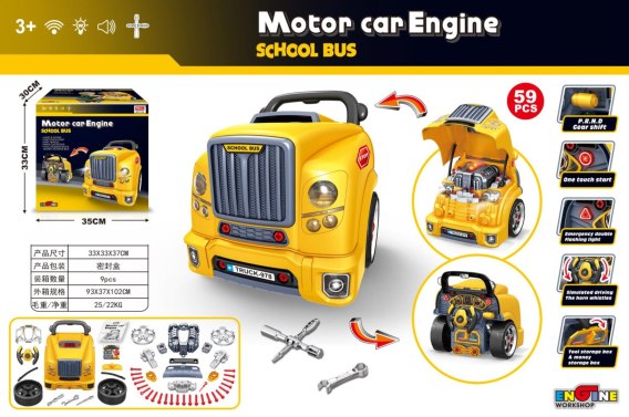 Interaktywna zabawka, przód żółtego autobusu szkolnego z podnoszoną maską oraz deską rozdzielcząprzeznaczony dla dzieci od 3-go roku życia. Komplet zawiera części do złożenia przodu autobusu oraz narzędzia potrzebne w montażu i demontażu części takie jak śrubokręt, czy klucze. Pod maską autobusu znajduje się duży rozkręcany silnik, który dziecko może rozłożyć na czynniki pierwsze. Do wymiany nadają się także świece zapłonowe oraz koła. Na desce rozdzielczej znajduje się przycisk startu pojazdu z odgłosami zapalania silnika, kierownica z klaksonem oraz sygnalizator awaryjny. Pod kierownicą umiejscowiony jest schowek, do którego można włożyć wszystkie niezbędne narzędzia, śruby, pokrętła. Zabawka posiada wygodną rączkę do przenoszenia. Zasilanie bateriami typu 3 x AA 1,5 V (brak w zestawie). Zabawka dla małego mechanika rozwija umiejętności manualne, małą motorykę oraz koordynację oko-ręka.