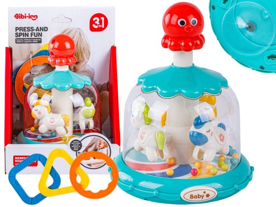 Zabawka jest bardzo prosta w obsłudze - wystarczy, że maluszek naciśnie przycisk z ośmiornicą a karuzela wprawi się w ruch i zacznie się obracać jak bączek. Ruchome kucyki i kolorowe kuleczki pobudzają zmysły i zachęcają malucha do aktywnej zabawy.