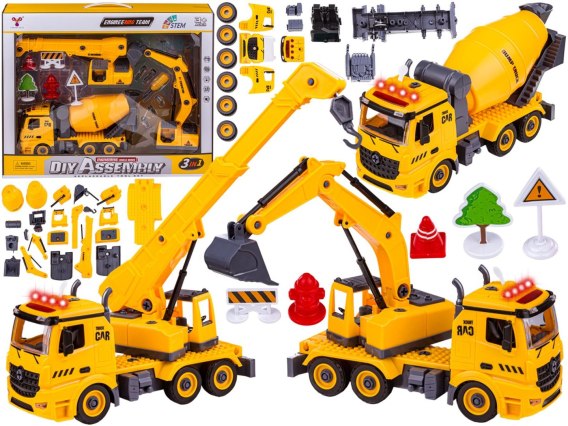 Zestaw wyposażony został w wymienne elementy - dzięki czemu w zależności od potrzeb na placu budowy nasza ciężarówka może przemienić się w betoniarkę, koparkę lub dźwig z ruchomym hakiem. Każdy z elementów można rozkręcić na mniejsze części. Hak posiada ruchome - wyciągane ramię, koparka posiada ruchomą łyżkę a betoniarka obraca się jak prawdziwa.