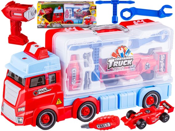 Rozkręcany tir z bolidem to idealna zabawka dla małych majsterkowiczów. Zestaw ten rozwija kreatywność, logiczne myślenie i zdolności manualne. W skład zestawu wchodzi mnóstwo części, m.in. koła, dach ciężąrówki, wyścigówka, śruby.
