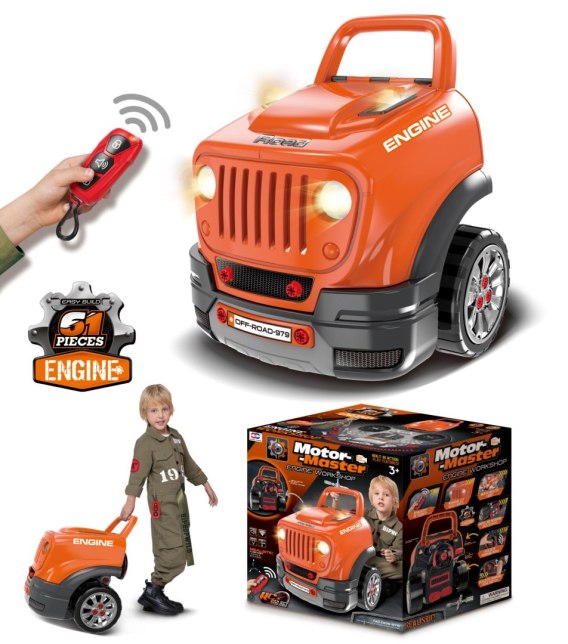 Interaktywna zabawka, przód ciężarówki z podnoszoną maską oraz deską rozdzielczą  przeznaczona dla dzieci od 3-go roku życia. Komplet zawiera elementy ciężarówki oraz narzędzia potrzebne w montażu i demontażu części takie jak śrubokręt, czy klucze. Pod maską ciężarówki znajduje się duży rozkręcany silnik, który dziecko może rozłożyć na czynniki pierwsze. Do wymiany nadają się także świece zapłonowe oraz koła. Na desce rozdzielczej znajduje się przycisk startu pojazdu z odgłosami zapalania silnika, ruchoma kierownica z klaksonem oraz sygnalizator awaryjny. Pod kierownicą umiejscowiony jest schowek, do którego można włożyć wszystkie niezbędne narzędzia, śruby, pokrętła. Samochód wyposażony jest w automatyczną skrzynię biegów-posiada drążek zmiany biegów jak w prawdziwym pojeździe. W zależności od zmiany drążku biegu na odpowiednie przełożenie usłyszymy odgłos na przykład odpalonego pojazdu, odgłos jazdy lub przy biegu wstecznym odgłos cofania. Zestaw zawiera pilota w kształcie kluczyków do samochodu, który umożliwia sterowanie modułami świetlnym (świecące reflektory i góra silnika) i dźwiękowymi (odgłos otwierania i zamykania samochodu, klakson). Zabawka posiada wygodną rączkę do przenoszenia. Zasilanie bateriami typu 3 x AA 1,5 V - auto (brak w zestawie), CR2025 3V- pilot (w zestawie). Zabawka dla małego mechanika rozwija umiejętności manualne, małą motorykę oraz koordynację oko-ręka.
