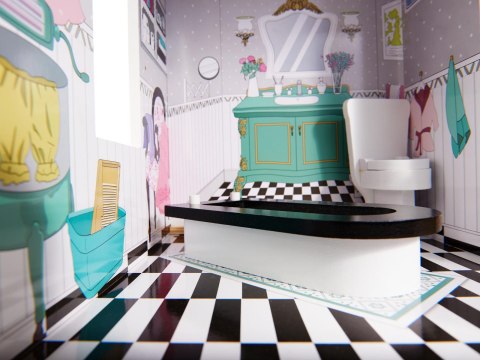 • Meble(łóżko z baldachimem materacem i poduszką, szafka nocna, 2xkrzesła, stół, fortepian, lampka, parasol, kanapa, wanna, toaleta WC)
