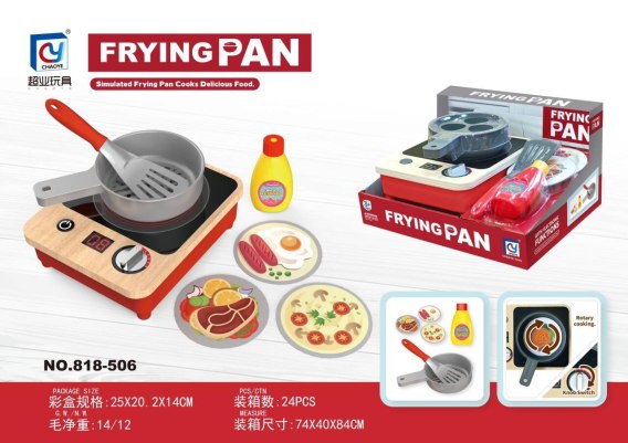 Drewniana kuchenka z akcesoriami dla dzieci powyżej trzeciego roku życia. Zestaw wykonano z najlepszej jakości materiałów: drewna i plastiku. Żywe kolory przyciągają wzrok dziecka i zachęcają do zabawy. Kuchenkę wyposażono w akcesoria: patelnię, łopatkę, atrapę ketchupu i 3 tace: z mięsem, warzywami oraz jajkiem sadzonym i kiełbaskami. Kuchenka posiada ruchomy palnik, którym zwiększamy temperaturę, podświetlany wyświetlacz z mocą grzania i wydaje odgłosy pracy urządzenia. Kuchenka zasilana jest bateriami typu 3 x AA 1,5 V (brak w zestawie).