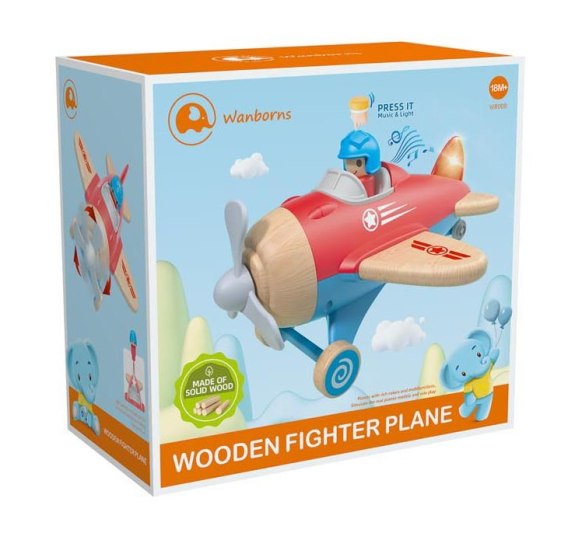 Interaktywny samolot z funkcją dźwięku i światła dla dzieci od osiemnastego miesiąca życia. Samolocik wykonano z najlepszej jakości materiałów: drewna i plastiku. Bogactwo kolorów przyciąga wzrok dziecka i zachęca do zabawy. Samolocik posiada podświetlenie tylnego skrzydła oraz funkcję dźwięków, odtwarza melodię i odgłosy startu samolotu, po naciśnięciu na figurkę lotnika. Zabawka zasilana jest bateriami typu 3 X AG13 (baterie znajdują się w zestawie).