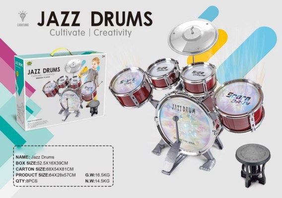Duża perkusja z podświetlanymi bębnami dla dzieci od 3-go roku życia. Perkusja wykonana została z bezpiecznych, wysokiej jakości materiałów. Z wyglądu przypomina profesjonalny instrument. Wyposażona jest w pięć bębnów, talerz, komplet pałeczek oraz krzesełko. Niebywałą atrakcją zestawu są podświetlane bębny, które nauczą dziecko wybijać rytm. Zabawa tym zestawem rozwija umiejętności muzyczne, zmysł słuchu i uczy odróżniać dźwięki. Zabawka zasilana jest bateriami typu 9 x AG10 (w zestawie).