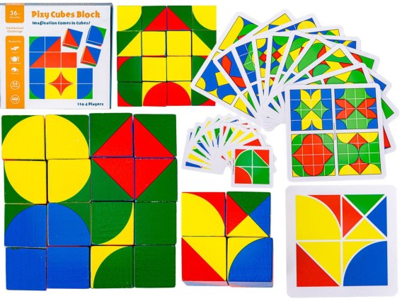 Zabawa polega na tym aby dziecko ułożyło z drewnianych klocków wybrany z szablonu układ. Każdy klocek posiada na ściankach różne wzory i kolory. Poprzez ich odpowiednie dopasowanie możemy stworzyć piękny wzór / układ graficzny.