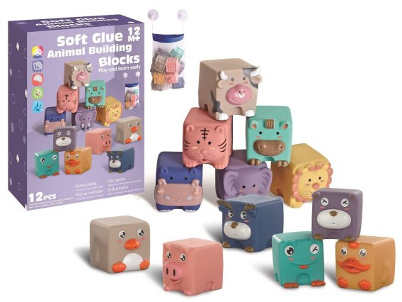 Niezwykle miękkie klocki zaciekawią każde dziecko. Klocki są gumowe i miłe w dotyku. Każdy z klocków posiada wizerunek innego, wesołego zwierzątka. Są one odporne na wodę, dzięki czemu idealnie nadają się do zabaw podczas kąpieli. Doskonale sprawdzą się również jako gryzak. W razie potrzeby klocki można bezpiecznie wyparzać w gorącej wodzie.
