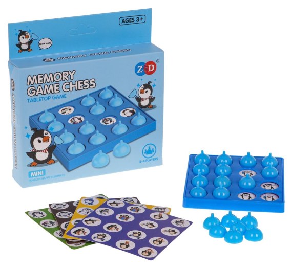 Logiczna gra rodzinna Memory, dla dzieci od 3-go roku życia i dorosłych. Zestaw składa się z dwupoziomowej planszy z otworami w postaci kółek i kart z rysunkami pingwina w różnych pozach. Wkładamy kartę z rysunkami, pomiędzy plansze i zasłaniamy otwory pachołkami. Gracze muszą zapamiętać, na którym polu ukryta jest dany pingwin. Podnosimy dany pachołek i próbujemy znaleźć identyczny rysunek. Wygrywa zawodnik, który odszuka najwięcej par. Gra uczy cierpliwości, ćwiczy pamięć i koncentrację.