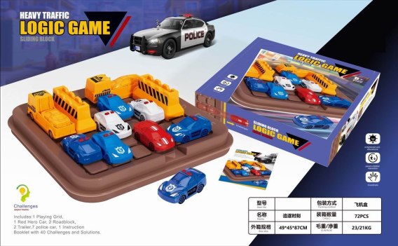 Logiczna gra Traffic dla dzieci od szóstego roku życia. Gra ma na celu opracowanie strategii jak wydostać się z korka ulicznego. Poruszać się możemy tylko do przodu i do tyłu. Gra wykonana została z najlepszej jakości materiałów w żywych kolorach. W zestawie znajduje się plansza, czerwony pojazd zadaniowy, dwie blokady drogowe, dwie ciężarówki, siedem pojazdów policyjnych, instrukcja z czterdziestoma zadaniami i rozwiązaniami.