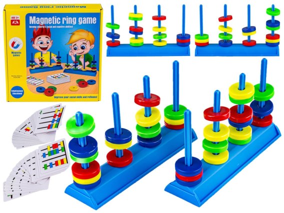 Powszechnie wiadomo, że każdy magnes ma dwa bieguny: północny i południowy. Identyczne bieguny się odpychają a różnoimienne przyciągają. Podczas zabawy naszą grą dziecko wykorzystując tą wiedzę ma za zadanie ułożyć na podstawce taki sam wzór z obręczy jak na wylosowanej karcie. Zadanie zostanie wykonane gdy gracz zachowa zgodnie z wzorem zarówno kolory jak i "odstępy" pomiędzy krążkami.