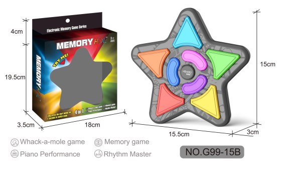 Elektroniczna, logiczna kieszonkowa gra w kształcie gwiazdy Memory dla dzieci od trzeciego roku życia. Ta popularna gra polega na powtarzaniu sekwencji wyświetlających się wcześniej kolorów. Grę rozpoczynamy po naciśnięciu dużego przycisku MEMORY znajdującego się na środku gry. Następnie komputer wskazuje - podświetla kolorowe pola, które należy odtworzyć. Z każdą sekwencją poziom trudności się zwiększa. W przypadku pomyłki słychać charakterystyczny dźwięk i grę należy rozpocząć na nowo. Urządzenie oferuje aż 4 różne tryby gry, które zmieniamy przez przytrzymanie środkowego przycisku. Dodatkowym atutem gry jest nieduża wielkość, dlatego można schować ją do kieszeni i zabrać ze sobą praktycznie wszędzie. Gra zasilana jest bateriami typu 2 x AA (baterie zostały dołączone do zestawu).