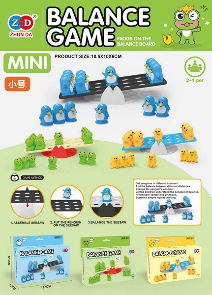 Gra zręcznościowa Balansująca Kaczka dla dzieci od 3-go roku życia. Ta fascynująca gra, zapewni Twojemu dziecku, długie godziny edukacyjnej zabawy. Gra składa się z podstawy, w której znajdują się wgłębienia i małych figurek kaczek. Zadaniem dziecka jest układanie kaczek po jednej i drugiej stronie, tak, żeby utrzymać równowagę podstawy. Gra rozwija umiejętności dodawania, logiczne myślenie, wyobraźnie i kreatywność. Dziecko poznaje podstawy matematyki i fizyki.