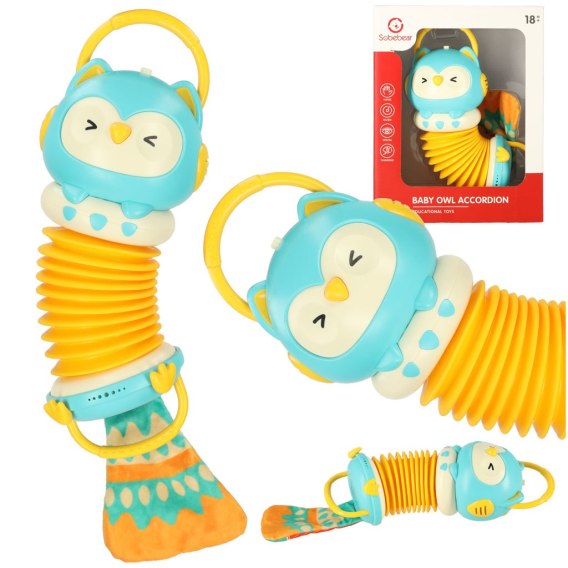 Harmonia akordeon zabawka sensoryczna dla dzieci sowa niebieska grająca LED 30cm