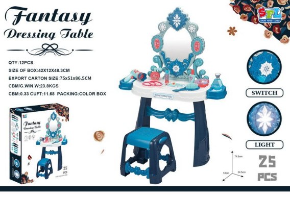 Interaktywna toaletka z lustrem, taboretem i akcesoriami dla małej księżniczki od trzeciego roku życia. Zabawka posiada funkcję dźwięku i światła (mrugająca gwiazdka nad lustrem i dwie gwiazdki po bokach lustra). Zabawka zasilana jest bateriami typu 3 x AA 1,5V (brak w zestawie). Do zestawu dołączono suszarkę do włosów, szczotkę oraz atrapy kosmetyków.