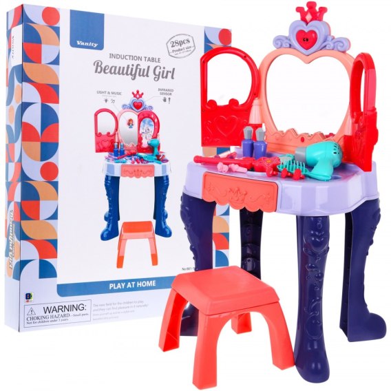 Toaletka z akcesoriami i stołeczkiem to zabawka dla małych księżniczek od 3-go roku życia. Zabawka posiada efekty dźwiękowe i świetlne. Zasilana jest bateriami typu 3 x 1,5V AA, których brak w zestawie. Na baterie jest również suszarka, która działa jak prawdziwa, wydaje odgłosy i posiada nawiew. Zasilanie suszarki 1 x 1,5 V AA.