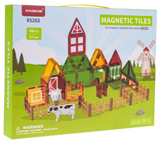 Kolorowe klocki magnetyczne z serii farma dla dzieci od 3-go roku życia. Zestaw składa się z 42 klocków w różnych kolorach i kształtach. Prócz klocków mamy również figurkę baranka, konika i krówki. Z klocków ułożyć możemy farmę, w obrazkowej instrukcji widać, jak zrobić to krok po kroku, ale możemy również zbudować farmę według własnego pomysłu. Zabawa klockami pobudza wyobraźnię i kreatywność dziecka, ćwiczy zdolności manualne i koncentrację.