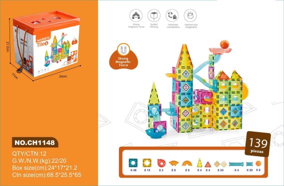 Zestaw kolorowych klocków magnetycznych dla dzieci od 3-go roku życia. Zestaw składa się z 139 elementów i pozwala na zbudowanie toru dla kulek o dowolnym układzie. Klocki wykonane zostały z najlepszej jakości tworzywa, są gładkie i starannie wykonane. Łączymy je ze sobą za pomocą wbudowanych magnesów. Magnesy bardzo dobrze trzymają, zapewniając stabilność konstrukcji. W zestawie znajduje się obrazkowa instrukcja złożenia przykładowych torów. Pudełko na klocki posiada wygodne sznureczki do przenoszenia, a na jego pokrywce znajduje się sorter kształtów.