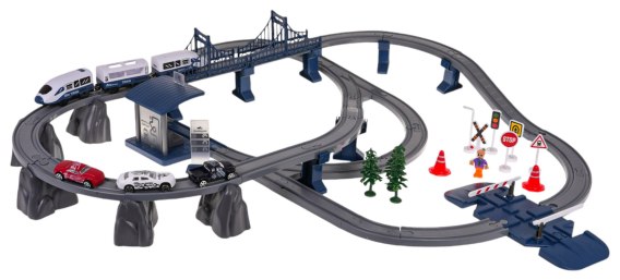 Bogato wyposażony zestaw tory kolejowe, pociąg i akcesoria dla dzieci od 3-go roku życia. Zestaw wykonany został z najlepszej jakości plastiku, jest solidny i wytrzymały. Zawiera aż 103 elementy: elementy konstrukcyjne dwupoziomowego toru, pociąg, stację z efektami dźwiękowymi i świetlnymi, most, szlaban, znaki drogowe, autka i figurkę chłopca. Stacja zasilana jest bateriami typu 3 x AG3 1,5 V (w zestawie), pociąg bateriami typu 2 x AAA 1,5 V (brak w zestawie).