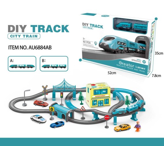 Bogato wyposażony zestaw torów z pociągiem i akcesoriami dla dzieci od 3-go roku życia. Zestaw wykonany został z najlepszej jakości plastiku w żywych kolorach przyciągających wzrok dziecka. W zestawie znajduje się 92 elementów: części konstrukcyjne torów, pociąg, stacja, most, supermarket, znaki drogowe oraz autka i figurka. Pociąg zasilany jest bateriami typu 2 x AAA 1,5 V (brak w zestawie).