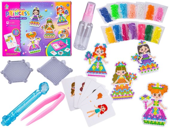 Zestaw posiada 6 kart z księżniczkami. Za pomocą koralików dziecko może stworzyc niepowtarzalne kreacje dla każdej księżniczki. Korona, sukienka, berło, bukiet kwiatów - możliwości zdobienia jest nieskończenie wiele.