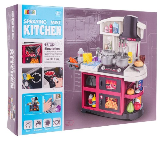 Interaktywna kuchnia z funkcją światła, dźwięku i kranikiem, z którego wydobywa się woda, a także mnóstwem akcesoriów, dla dzieci od 3-go roku życia. Kuchnia została znakomicie wykonana, z najlepszej jakości plastiku i jest w żywych kolorach zachęcających dziecko do zabawy. Na blacie kuchni znajduje się interaktywna płyta z palnikami. Po przekręceniu jednego z pokręteł słychać odgłosy gotowania, a drugiego, odgłos smażenia, któremu towarzyszy podświetlenie palników. Po dodaniu paru kropelek wody na palnik wydobywa się z niego zimna para wodna. Z kranu faktycznie wypływa woda, jak w prawdziwym zlewie, dziecko będzie mogło umyć zabawkowe naczynia. W zestawie mamy też atrapę piekarnika z otwieranymi drzwiczkami i atrapę grilla z otwieranymi drzwiczkami oraz mnóstwo półeczek, na których ułożyć możemy atrapy produktów. Cały zestaw prezentuje się znakomicie. Zabawka zasilana jest bateriami typu 3 x AA 1,5 V (brak w zestawie).
