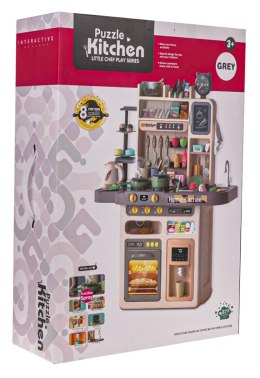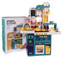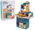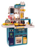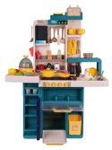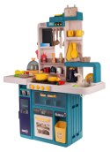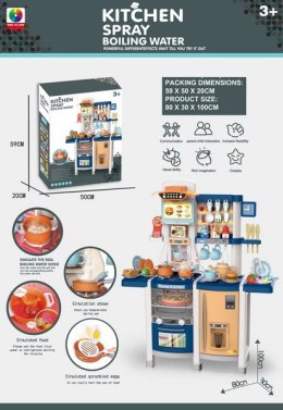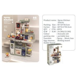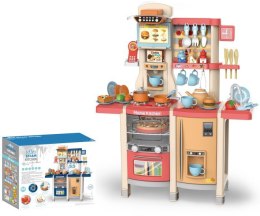 Interaktywna kuchnia z funkcją światła, pary wodnej, dźwięku i kranikiem, z którego wydobywa się woda, a także mnóstwem akcesoriów, dla dzieci od 3-go roku życia. Kuchnia została znakomicie wykonana, z najlepszej jakości plastiku i jest w żywych kolorach zachęcających dziecko do zabawy. Na blacie kuchni znajduje się interaktywna płyta z palnikami. Po przekręceniu jednego z pokręteł słychać odgłosy gotowania, a drugiego, odgłosy smażenia. Odgłosom gotowania i smażenia towarzyszy podświetlenie palników. Dodatkowo z garnka wydobywa się zimna para wodna. Z kranu faktycznie wypływa woda, jak w prawdziwym zlewie, dziecko będzie mogło umyć zabawkowe naczynia. Do zestawu dołączono również tablicę kredową, na której można przygotować np. przepis lub listę na zakupy. W zestawie mamy też atrapę lodówki z otwieranymi drzwiczkami, otwierany piekarnik i szufladka oraz mnóstwo półeczek, na których ułożyć możemy atrapy produktów. Jajowar dołączony do zestawu, posiada obrotową górną część oraz dźwięki i światełka. Na górze zestawu kuchennego znajduje się panelik muzyczny z przyciskami uruchamiającymi różne melodie. Cały zestaw prezentuje się znakomicie. Zabawka zasilana jest bateriami typu 8 x AA 1,5 V (brak w zestawie).