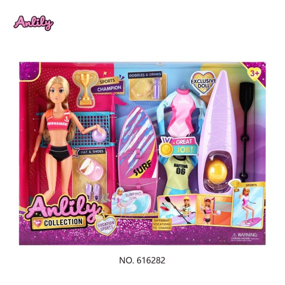 Zestaw lalka Olga na wakacjach i akcesoria dla dzieci od trzeciego roku życia. Laleczka ubrana jest w wygodny strój do gry w siatkówkę, w zestawie znajdują się dwa inne stroje do surfowania i na kajak, w które możemy przebierać laleczkę. Jest też deska do surfowania, kajak, wiosła, kask, siatka do siatkówki, czapka z daszkiem, buty, okulary i butelka na wodę, a nawet puchar zwycięstwa. Z tym zestawem twoja pociecha nie będzie się nudzić. Laleczka posiada ruchome rączki, nóżki, zginane kolana, łokcie, ruchome dłonie i głowę, co ułatwia jej wcielanie się w różne role.