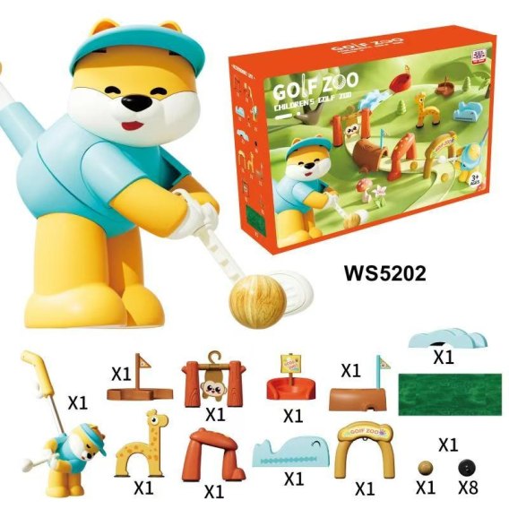 Tor do gry w golfa ze zwierzakami z zoo i matą piankową dla dzieci powyżej trzeciego roku życia. Idealna zabawka zarówno do domu jak i na zewnątrz. Elementy toru wykonano z najlepszej jakości tworzyw sztucznych, bezpiecznych dla dzieci. Zabawka idealna do aktywnego spędzenia czasu. Zadaniem dziecka jest poprowadzenie piłki do dołka. Misiu golfista posiada kij, na którym znajduje się kółeczko z suwakiem. Przesuwając suwak do siebie, powodujemy uderzenie kijem golfowym w piłeczkę. Piłeczkę wykonano z drewna, jest lekka i dobrze się toczy. Dołek zasilany jest bateriami typu 3 x AG13 (w zestawie). Po trafieniu piłeczką w dołek usłyszymy fanfary.