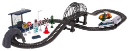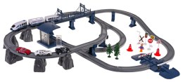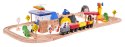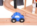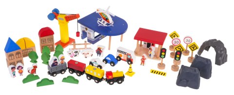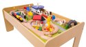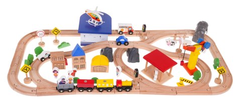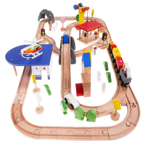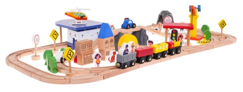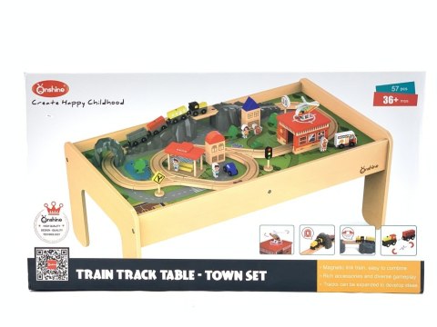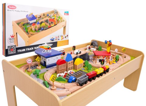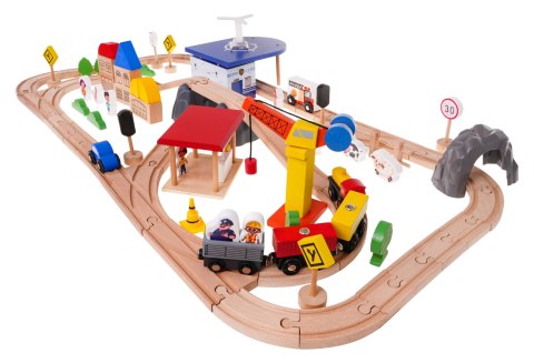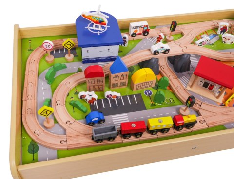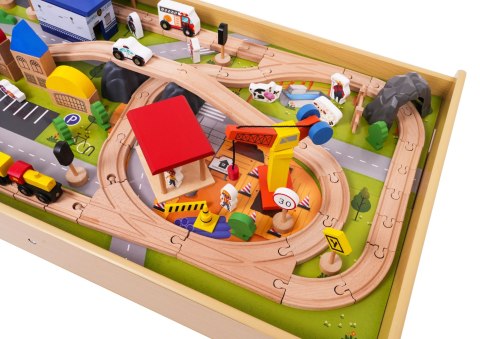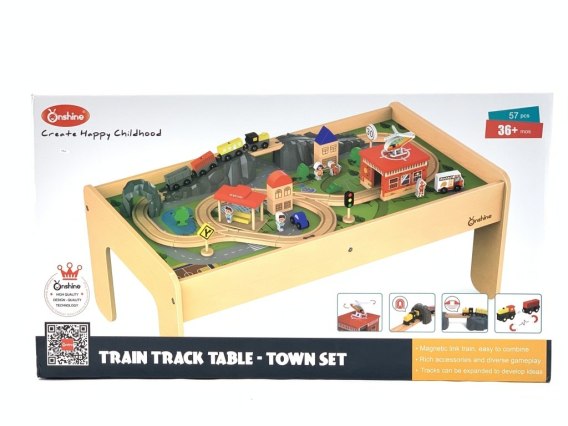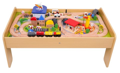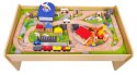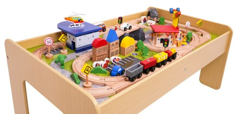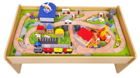 Drewniana kolejka ze stolikiem i mnóstwem akcesoriów, dla dzieci od 3-go roku życia. W skład zestawu wchodzi 101 drewnianych elementów umieszczonych na drewnianym, stabilnym stole z rysunkiem drogi na blacie. Ponadto stolik posiada wystające ponad poziom blatu krawędzie, co zapobiega spadaniu elementów zestawu.