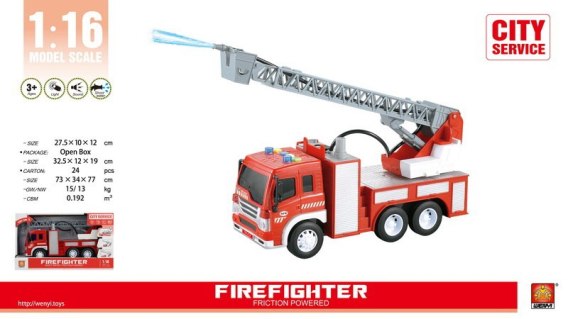 Interaktywna straż pożarna z funkcją dźwięku i światła, oraz lejącą się wodą dla dzieci od 3-go roku życia. Wóz strażacki został wykonany z najlepszej jakości materiałów w żywych kolorach. Posiada ruchome elementy takie jak regulowana drabina w górę i w dół,a także wydłużana i skracana. Na końcu drabiny znajduje się platforma z końcówką węża strażackiego, z którego leci woda. Na początku przyczepy, umieszczony jest zbiornik na wodę. Po napełnieniu zbiornika wodą wystarczy przycisnąć przycisk znajdujący się na górze zbiorniczka a poleci woda. Na dachu kabiny wozu strażackiego znajdują się przyciski, po naciśnięciu, na które usłyszymy sygnał syreny, klakson lub odgłos odpalania pojazdu. Odgłosom towarzyszy miganie koguta strażackiego. Pojazd posiada gumowe opony i napęd frykcyjny na przedniej osi. Zasilany jest bateriami AG13 (w zestawie).