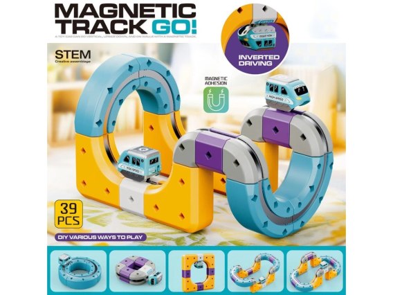 Prezentowany zestaw konstrukcyjny typu STEM pozwala na samodzielne budowanie torów, które wykorzystują przyciąganie magnetyczne, umożliwiając pociągom jazdę nawet w odwróconej pozycji.