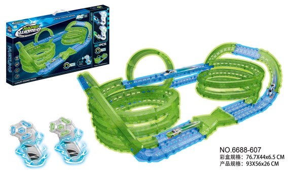 Duży tor wyścigowy świecący w ciemności to propozycja dla dzieci od szóstego roku życia. Zestaw składa się z dwóch pilotów, dwóch samochodów i części konstrukcyjnych toru. Piloty zasilane są bateriami typu 2 x AAA (brak w zestawie), samochody akumulatorami typu 3,7V (zawarte w zestawie).Tor jest fluorescencyjny, świeci w ciemności. Samochodziki posiadają podświetlenie LED, jeżdżąc, tworzą niesamowite efekty. Zabawa torem pozytywnie wpływa na koordynację wzrokowo-ruchową, budowanie toru pobudza wyobraźnię dziecka oraz rozwija zdolności manualne.