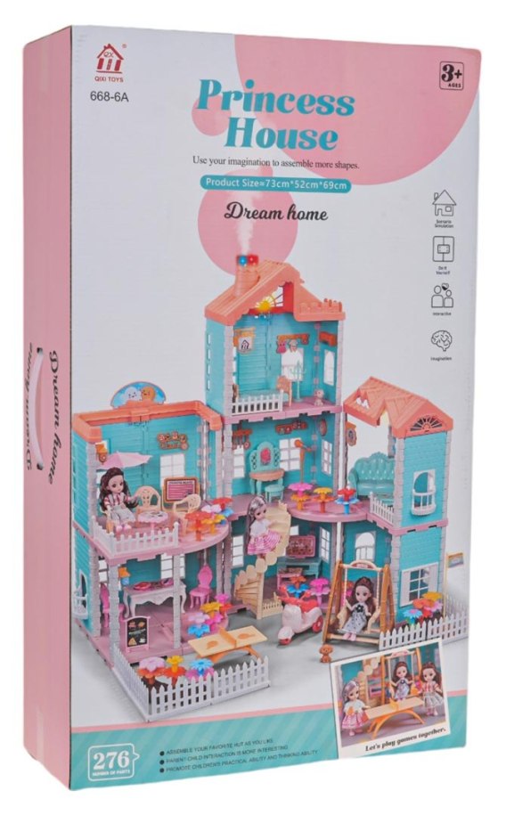 Śliczny, duży, interaktywny domek dla lalek z pełnym wyposażeniem i trzema laleczkami w zestawie dla dzieci powyżej 3-go roku życia. Domek posiada funkcję światła (2 świecące się lampy) i funkcję dymu (z komina wydobywa się para przypominająca dym). Lampy zasilane są bateriami 3 x AG13 (na każdą), baterie znajdują się w zestawie, komin bateriami 3 x AAA 1,5 V (brak w zestawie). Domek składa się z 3 kondygnacji i pomieszczeń takich jak kuchnia, sypialnia, salon, jest też pokój muzyczny czy taras. Cały dom ozdobiony jest mnóstwem kwiatów. Na zewnątrz znajduje się również strefa relaksu z huśtawką czy stołem bilardowym. Zabawka wykonana została z najlepszej jakości plastiku w żywych kolorach przyciągających wzrok dziecka.