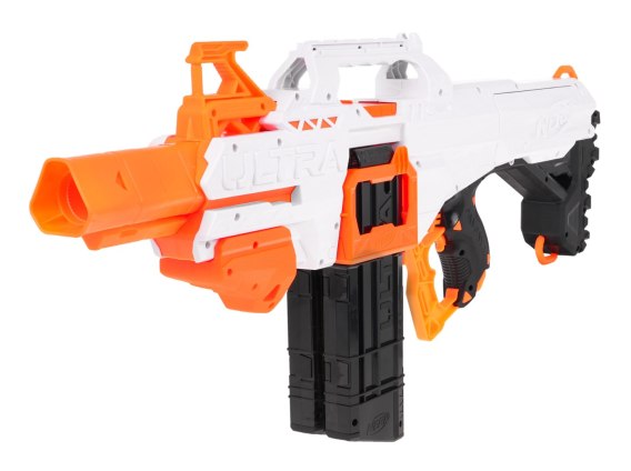 Nerf Ultra Select w pełni automatyczny karabin dla dzieci od 8-go roku życia. Karabin wyposażono w dwa magazynki które zmieszczą po 10 strzałek. Do zestawu dołączono 20 strzałek - 10 Nerf Ultra Distance i 10 Nerf Ultra Precision. Na przodzie karabinu znajduje się pomarańczowy przełącznik, którym ustawiamy z jakiego magazynku chcemy korzystać. Karabin zasilany jest bateriami typu 6 x C/LR14 1,5V, baterii brak w zestawie.