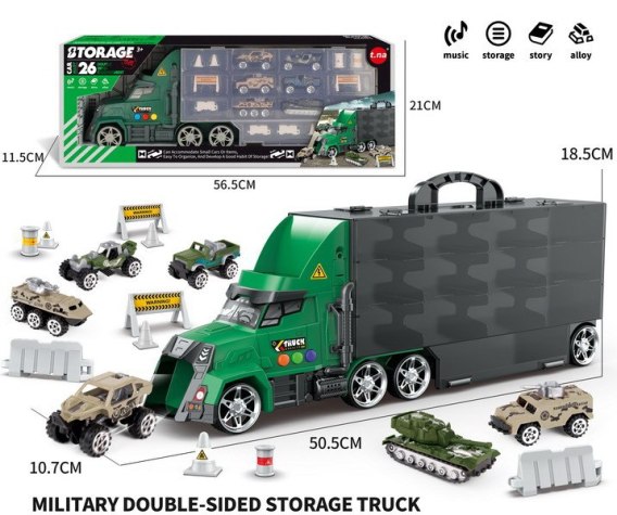 Interaktywny zestaw militarny, ciężarówka wojskowa z efektami dźwięku i światła oraz akcesoriami dla dzieci od 3- go roku życia. Ciężarówka kryje w sobie wiele tajemnic do odkrycia. Po bokach naczepy znajdują się otwierane schowki na akcesoria dołączone do zestawu. Na dachu kabiny jest zjeżdżalnia dla autek wojskowych znajdujących się w zestawie. Autko wkładamy w dach kabiny a wyjeżdża ono przodem pojazdu. Kabina ciężarówki posiada oświetlenie, a po bokach przyciski dźwiękowe, po wciśnięciu których usłyszymy odgłosy odpalania pojazdu, klaksony i wesołą melodię. Do zestawu dołączona akcesoria takie jak 6 autek wojskowych typu resoraki, 2 beczułki, 4 stożki, 4 płotki, 2 bariery stop. Zabawka zasilana jest bateriami typu 3 x LR44 1,5 V (w zestawie).