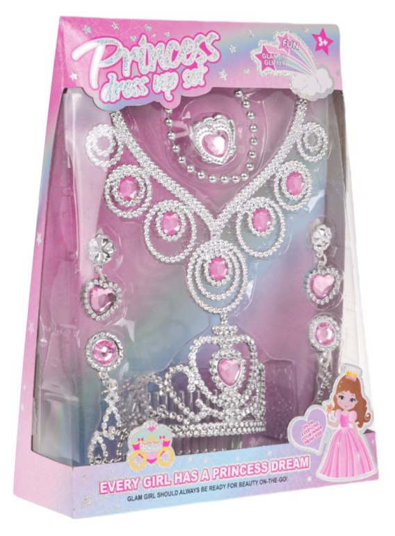 Bogato wyposażony zestaw małej księżniczki dla dzieci od 3-go roku życia. Zestaw wykonany został z dbałością o szczegóły i znajduje się w nim tiara, kolia, kolczyki oraz pierścionek. Każda mała dziewczynka poczuje się w nim jak księżniczka. Detale w tym zestawie wykonane zostały z plastikowych diamentów i imitacji kamieni szlachetnych, w srebrno-różowej kolorystyce. Wszystko zapakowane w pudełko, idealne na prezent.