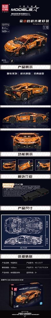 Wysokiej jakości klocki konstrukcyjne Mould King dla dzieci od ósmego roku życia. Zestaw składa się z 1620 elementów z których zbudować można pomarańczowe auto zdalnie sterowane. Auto jeździ we wszystkich kierunkach do przodu do tyłu w prawo i lewo. Sterować je można za pomocą pilota dołączonego do zestawu lub przy pomocy aplikacji w telefonie. Aplikację można pobrać skanując kod QR znajdujący się na opakowaniu. Dzięki aplikacji można nie tylko poruszać pojazdem, ale również zaprojektować jego ruchy. Zabawka zasilana jest akumulatorem typu 3,7V (w zestawie), pilot bateriami typu 2 x AA 1,5 V (brak w zestawie).