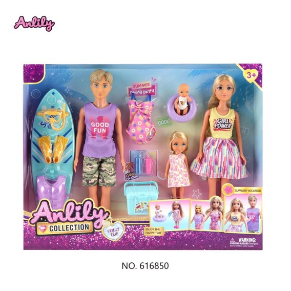 Zestaw lalek i akcesoriów z serii na wakacjach dla dzieci od trzeciego roku życia. Wszystkie elementy zestawu wykonano z najlepszej jakości materiałów z dbałością o szczegóły. W zestawie znaleźć możemy lalkę mamę, lalkę tatę, lalkę córkę i lalkę bobaska.Do laleczek dołączono następujące akcesoria: deskę do surfowania, maskę tlenową do nurkowania, płetwy do nurkowania, kamizelkę ochronną, strój kąpielowy, lodówkę turystyczną, 2 pojemniki na napoje, kółko do pływania. Z tym zestawem zabawa nie ma końca.