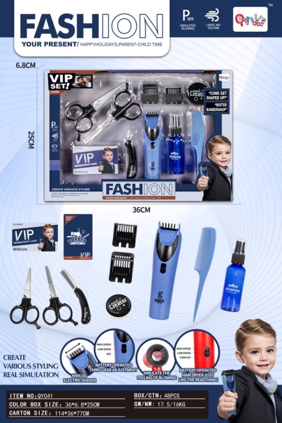 Bogato wyposażony zestaw barbera dla dzieci od trzeciego roku życia. Zestaw składa się z 11 elementów, wykonany został z najlepszej jakości materiałów, co gwarantuje mu długie użytkowanie. W skład zestawu wchodzą: maszynka do strzyżenia, 2 rodzaje nożyczek, brzytwa, 2 końcówki do maszynki, 2 rodzaje pojemniczków na kosmetyki do brody, grzebień, oraz dwie karty VIP. Z tak bogato wyposażonym zestawem, Twoja pociecha będzie mogła bawić się w strzyżenie, modelowanie zarostu, czy też fryzur. Maszynka posiada efekty dźwiękowe oraz ruchome ostrza. Zasilana jest bateriami typu 2 x AAA 1,5 V (brak w zestawie).
