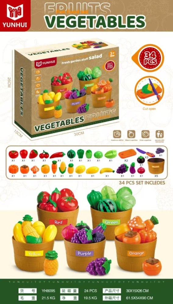 Kolorowy, bogato wyposażony zestaw owoców i warzyw dla dzieci od trzeciego roku życia. Elementy zestawu zostały wykonane z najlepszej jakości tworzywa sztucznego, a bogactwo kolorów przyciąga wzrok dziecka. W zestawie znajduje się aż 34 elementów: warzywa, owoce na rzepy, kosze do segregacji owoców i warzyw czy nożyki i deski do krojenia.