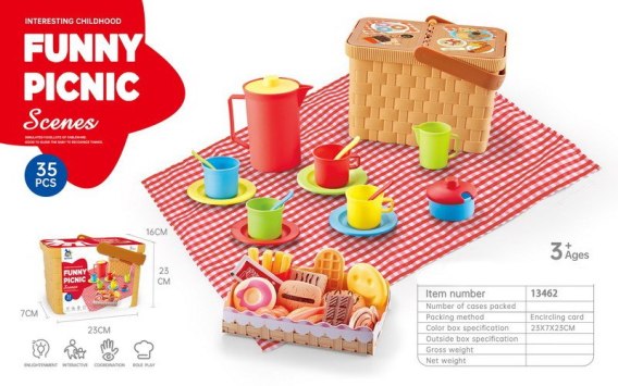 Koszyk piknikowy z akcesoriami dla dzieci od 3 - go roku życia. Idealny sposób na zabawę na świeżym powietrzu. Ten bogato wyposażony zestaw składa się z 35 elementów: pojemnego koszyka, dzbanka, filiżanek, talerzyków, łyżeczek oraz różnych smakołyków. W zestawie znajduje się również koc piknikowy.
