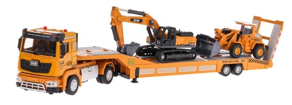 Interaktywny zestaw pojazdów budowlanych z lawetą dla dzieci od 3-go roku życia. Zestaw wykonany został z najlepszej jakości materiałów, metal łączony z plastikiem. Tir budowlany posiada efekty dźwiękowe i świetlne takie jak dźwięk odpalanego pojazdu, cofania, klaksonu, migające światła z przodu oraz na dachu ciężarówki. Wszystkie efekty uruchamiają się po naciśnięciu na pojazd. Karoseria pojazdu jest metalowa, a wszystkie pozostałe jej elementy są plastikowe. Koparka i spychacz posiadająmetalowe łyżki, oraz ruchome elementy takie jak łyżka, ramię, gąsienice. Tir budowlany posiada opuszczaną kabinę do przodu oraz napęd pull-back i gumowe opony, zapewniające mu lepszą przyczepność do podłoża. Lawetę możemy odpiąć odciężarówki. Tył lawety otwiera się, aby zapewnić lepszy rozładunek pojazdów budowlanych. Zabawka zasilana jest bateriami typu 3 x AG13 (w zestawie).