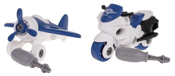 Zestaw rozkręcanych pojazdów dla dzieci od 3-go roku życia. W zestawie znajduje się motocykl, samolot i dwa śrubokręty. Pojazdy maluch może rozłożyć na czynniki pierwsze, a następnie samodzielnie je złożyć. Z tych dwóch pojazdów istnieje możliwość złożenia łodzi. W zestawie znajduje się obrazkowa instrukcja montażu.