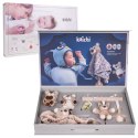 Zestaw upominkowy dla maluszka od pierwszych dni życia. Zestaw składa się z maskotek bezpiecznych dla maluszków. Znaleźć tu możemy dwa misie z zawieszką, misia z kocykiem, zawieszkę na łóżeczko z misiem, gwiazdką i liściem. Wszystko zapakowane w śliczne pudełko, idealnie nadaje się na prezent. Miś z kocykiem uspokaja, jest miękki i ciepły, możemy go zmieniać w lisa. Misie z zawieszką posiadają grzechotki w środku. Liść z zawieszki wyposażono w piszczałkę, misia w grzechotkę a gwiazdkę w odgłos szeleszczenia.